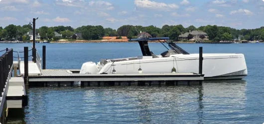 The floating docks and piers on Lake Norman are used throughout the lake. The floating dock and pier features a ramp and floating slip or floating unit with black Formex encapsulating foam floats. The floating slip or unit is secured into place using marine grade wood pilings or metal telescopic pilings. Wood pilings can be driven inside the slip and custom installed to accommodate the installation of a boat lift.